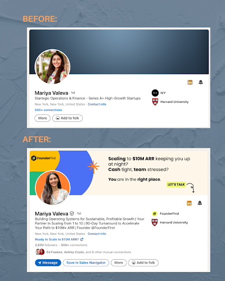 Use a professional headshot. Supplement with a banner that beams your firm’s logo, tagline, or even a city skyline. Profiles with images are viewed much more frequently than just plain profiles.